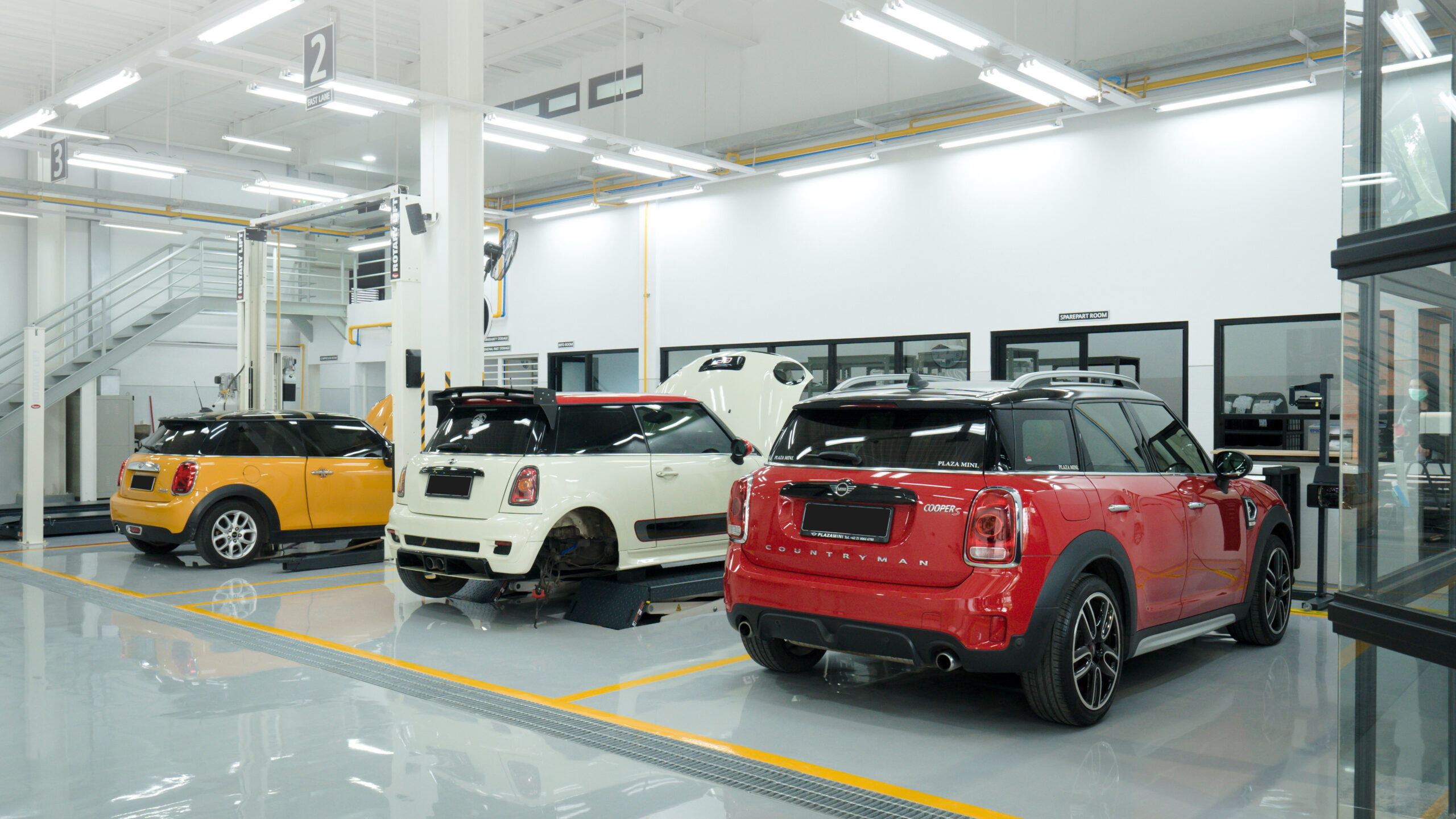 Selain showroom, tersedia juga area bengkel yang mampu menangani berbagai kebutuhan servis kendaraan MINI. Bengkel ini memiliki kapasitas 3 stall untuk unit yang masuk, sehingga proses pengerjaan dapat dilakukan dengan efisien dan terorganisir.